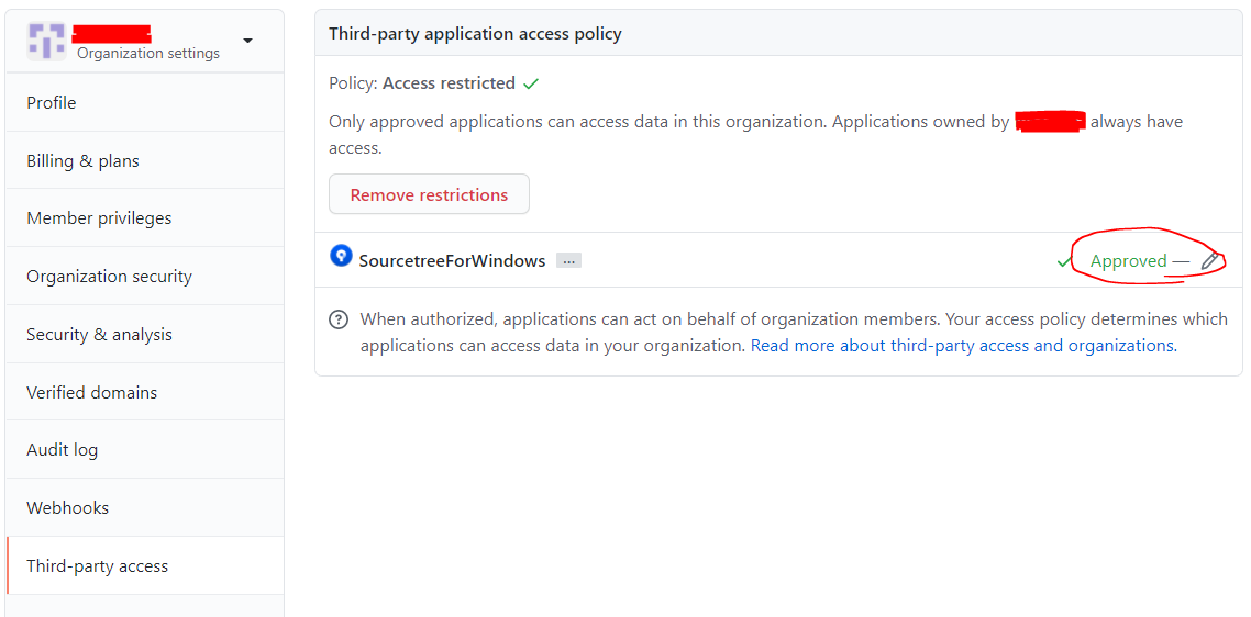 organization 계정에 settings - Third party access 에 들어가서 sourceTree에 접근이 허용되어 있는지 확인한다.