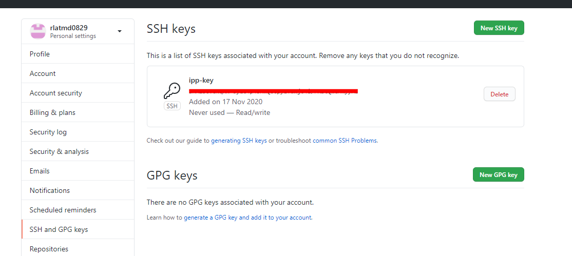 puTTYgen에서 나온 키값을 github 계정에 settings - SSH 키값을 등록해준다.