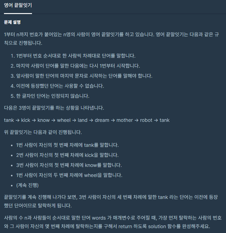 끝말잇기 배열이 주어졌을때 끝말잇기가 실패하는 경우가 두가지가 있다.