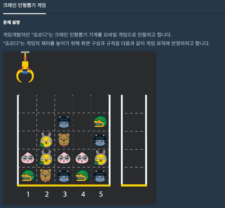 크레인이 움직이는 배열을 담고있는 moves를 for문으로 돌려 열로 지정하고 (moves에 1부터 들어가있는데 인덱스에 넣을때는 -1을 해준다.)