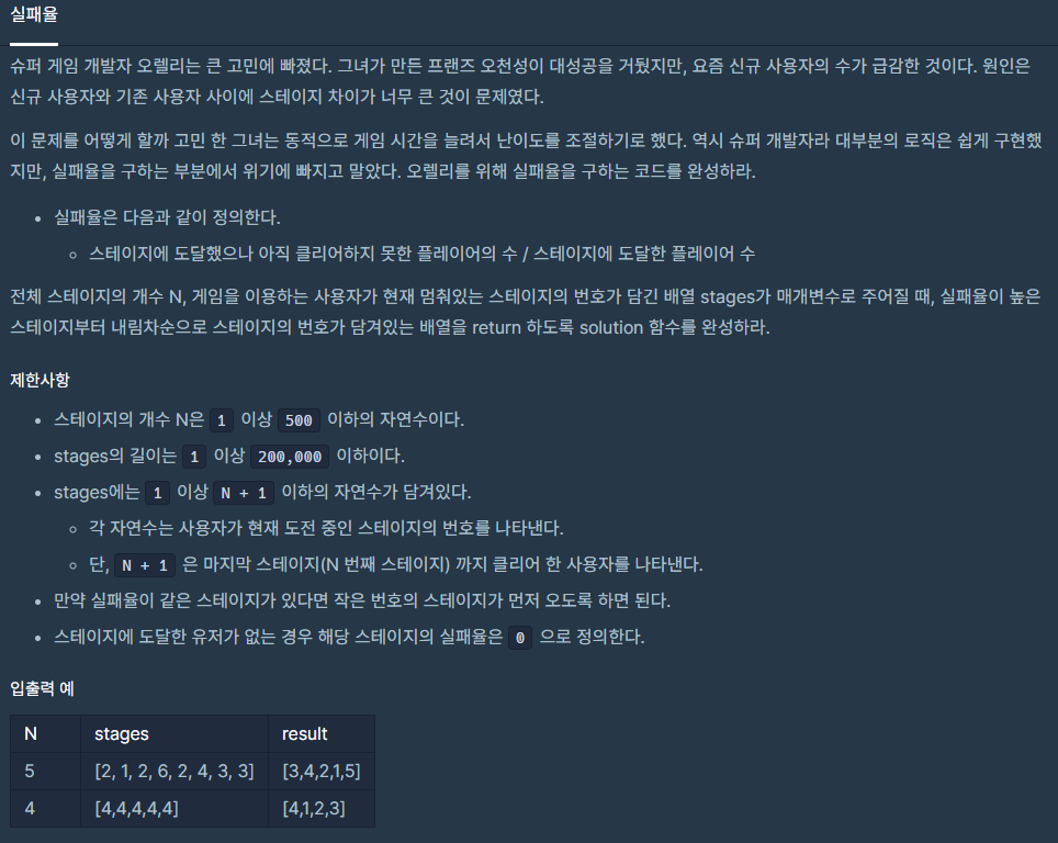 일단 실패율을 구하기 위해서 stages를 for문으로 돌아 1인 수를 찾는다고 했을때 1인수가 2개가 있다면 1스테이지를 못깬 사람이 2명 있다는 뜻이다. 그래서 총인원수 leng으로 나누면 실패율을 구할 수 있다.