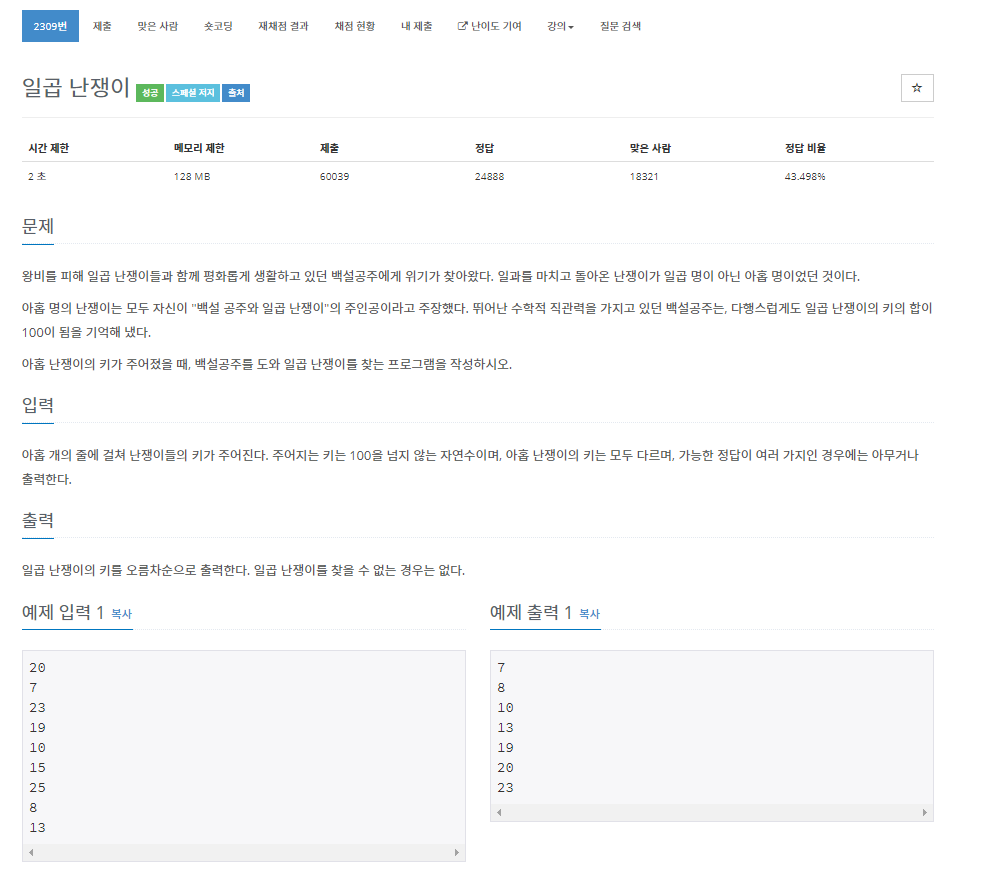 아홉 개의 줄에 걸쳐 난쟁이들의 키가 주어진다. 주어지는 키는 100을 넘지 않는 자연수이며, 아홉 난쟁이의 키는 모두 다르며, 가능한 정답이 여러 가지인 경우에는 아무거나 출력한다.