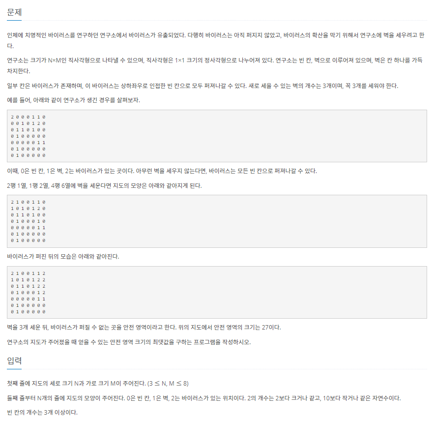 재귀를 하는 이유는 벽을 3개를 세웠을때 가장 안전영역이 큰 값을 구하기 위해서 모든 경우의 수를 돌아주기 위해서 이다.