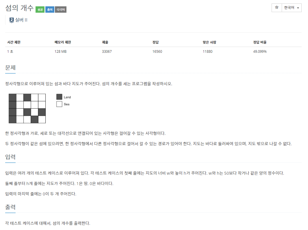 섬은 가로, 세로, 대각선으로 이어져있으면 하나의 섬으로 본다.
