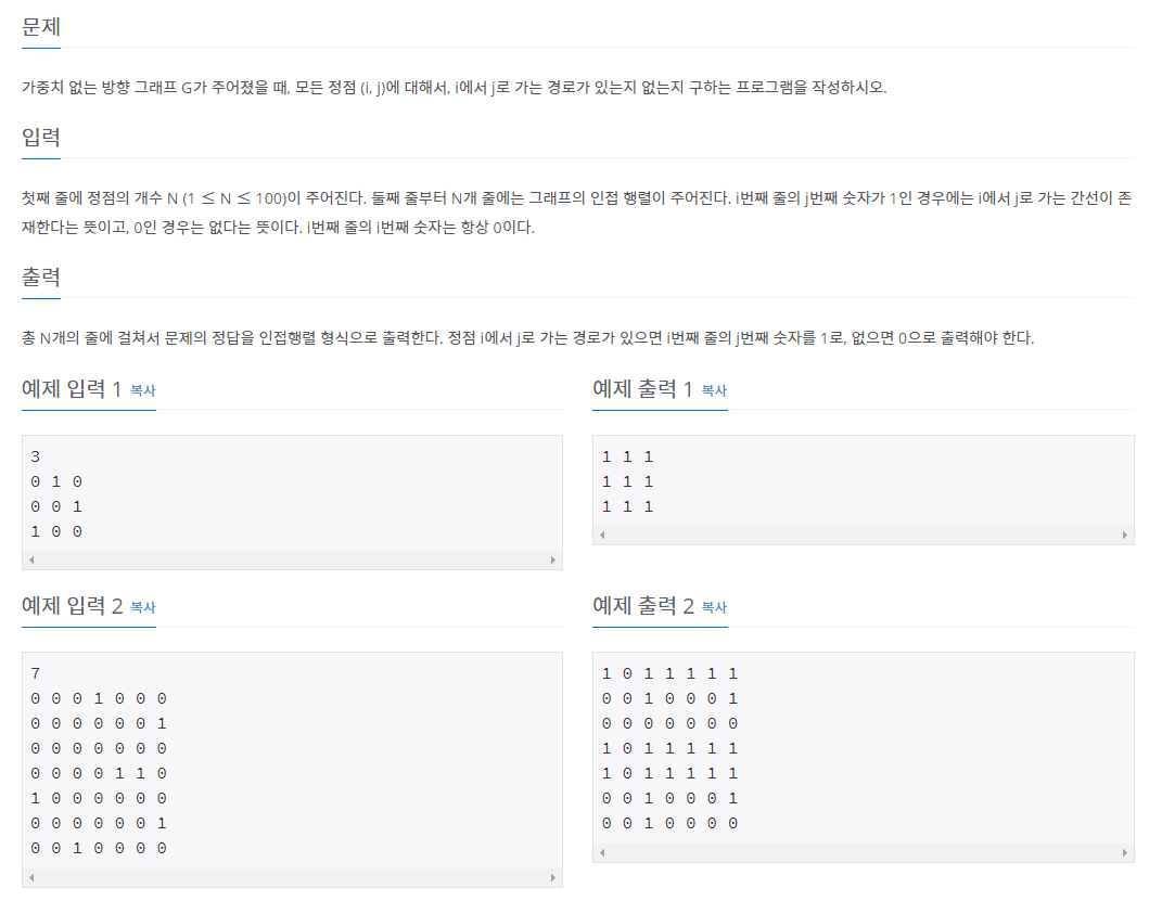 가중치 없는 방향 그래프 G가 주어졌을 때, 모든 정점 (i, j)에 대해서, i에서 j로 가는 경로가 있는지 없는지 구하는 프로그램을 작성하시오.