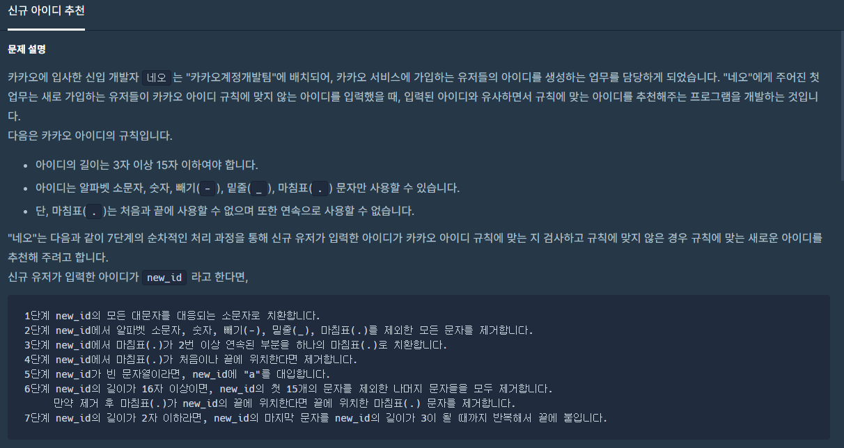 카카오에 입사한 신입 개발자 네오는 "카카오계정개발팀"에 배치되어, 카카오 서비스에 가입하는 유저들의 아이디를 생성하는 업무를 담당하게 되었습니다. "네오"에게 주어진 첫 업무는 새로
