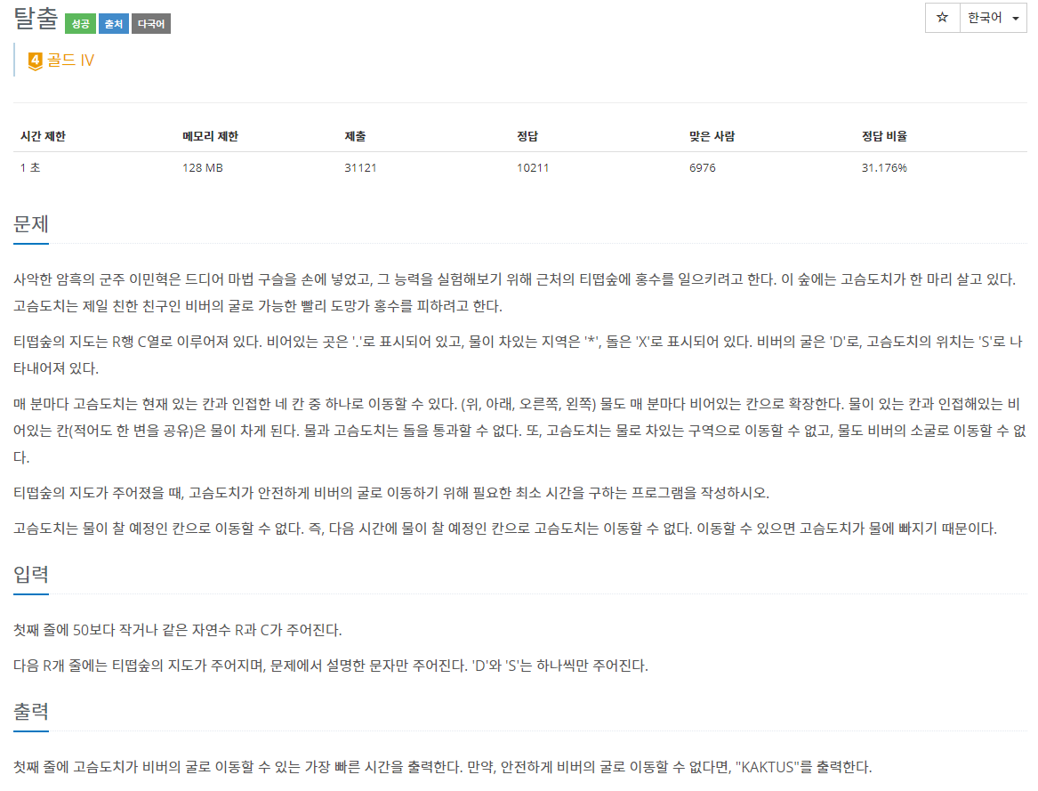 비버의집 위치를 저장후에 bfs를 돌리고 만약 비버의집 위치가 'S' 고슴도치라면 distance값 반환