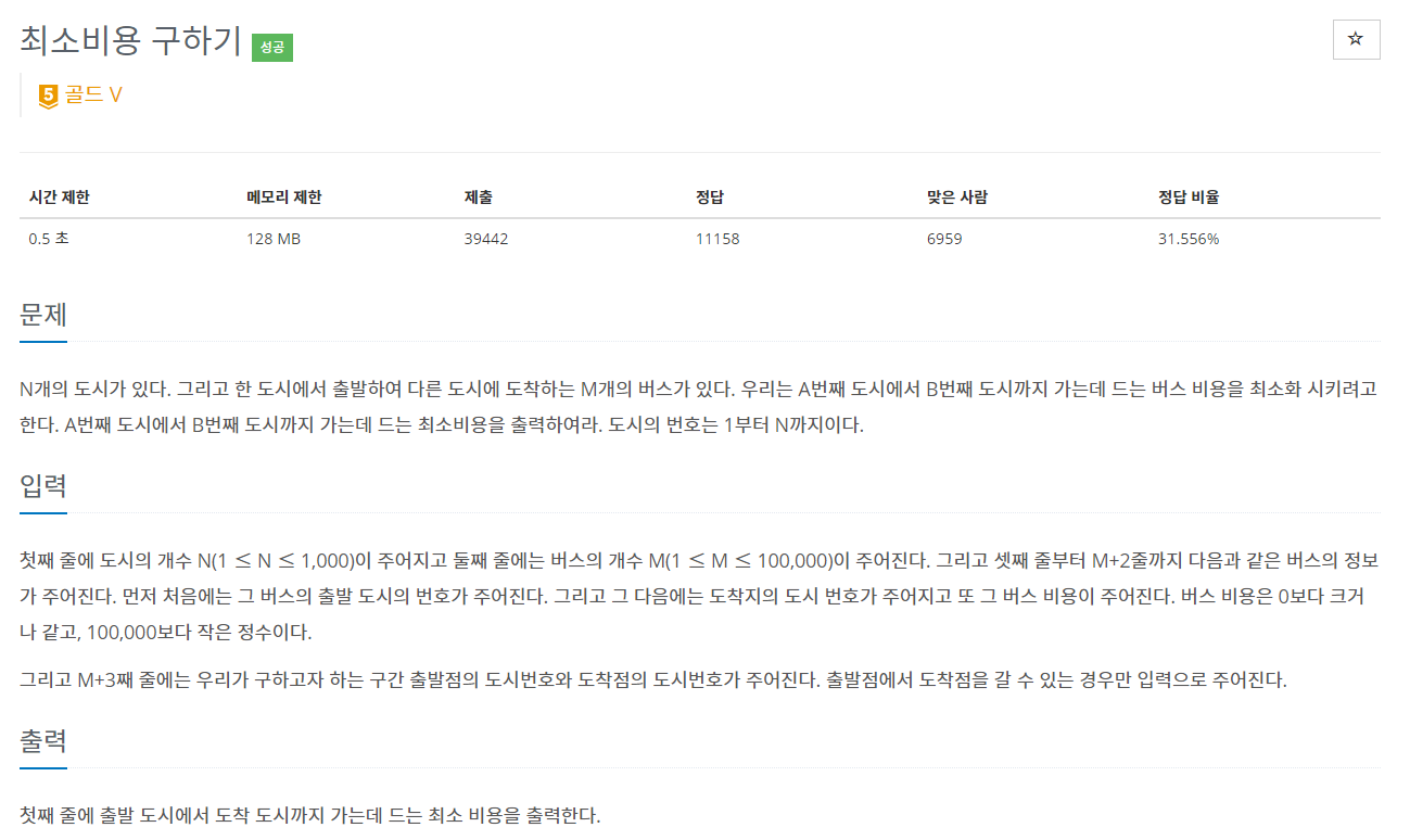 가중치가 주어지고 최소비용을 구하는 문제로 다익스트라를 사용하여 풀었다.