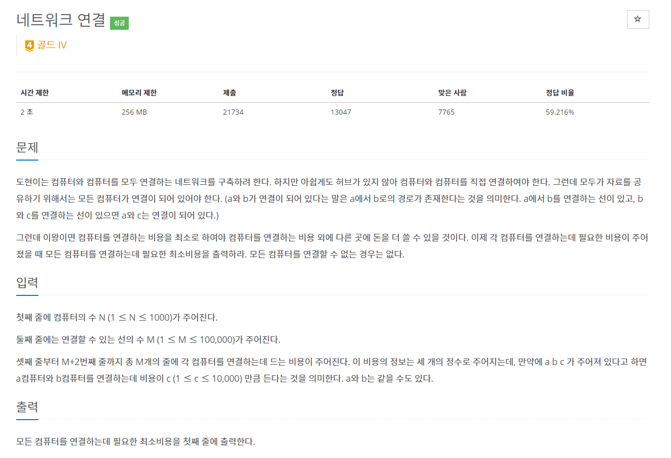 모든 정점을 연결하는 가장 작은 최소비용을 구해야한다. 모든 정점을 연결하는 최소 연결 횟수는 n-1개 이고 n-1개의 간선으로 연결되어 있으면 트리형태를 가지고있어 스패닝트리 문제이다.