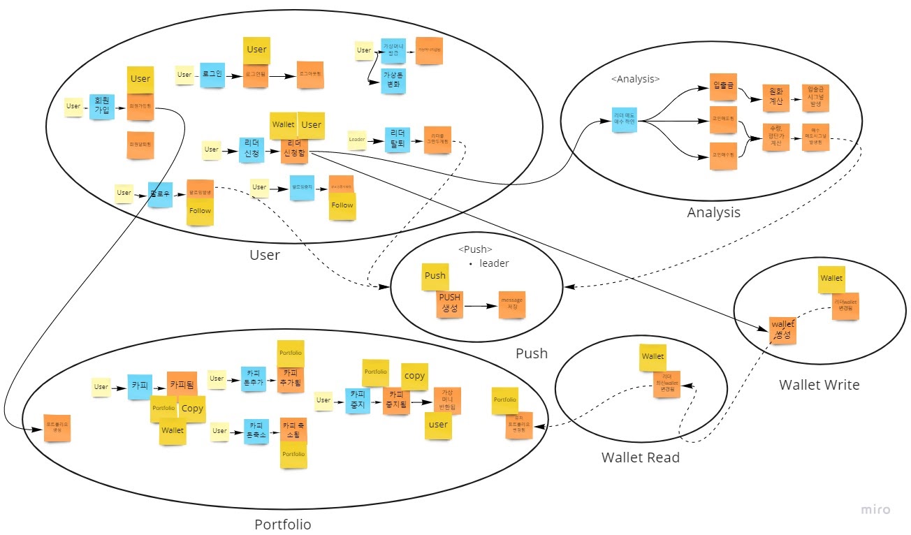 저희는 MSA 방식으로 개발을 진행하기 위해서 DDD에 대해서 공부를 하였고 miro 서비스를 사용해 이벤트 스토밍을 진행하였습니다. 서비스 흐름에 따라 마이크로 서비스를 도출해 도메인을 나눴고, 서비스 간의 관계를 정의하였습니다.