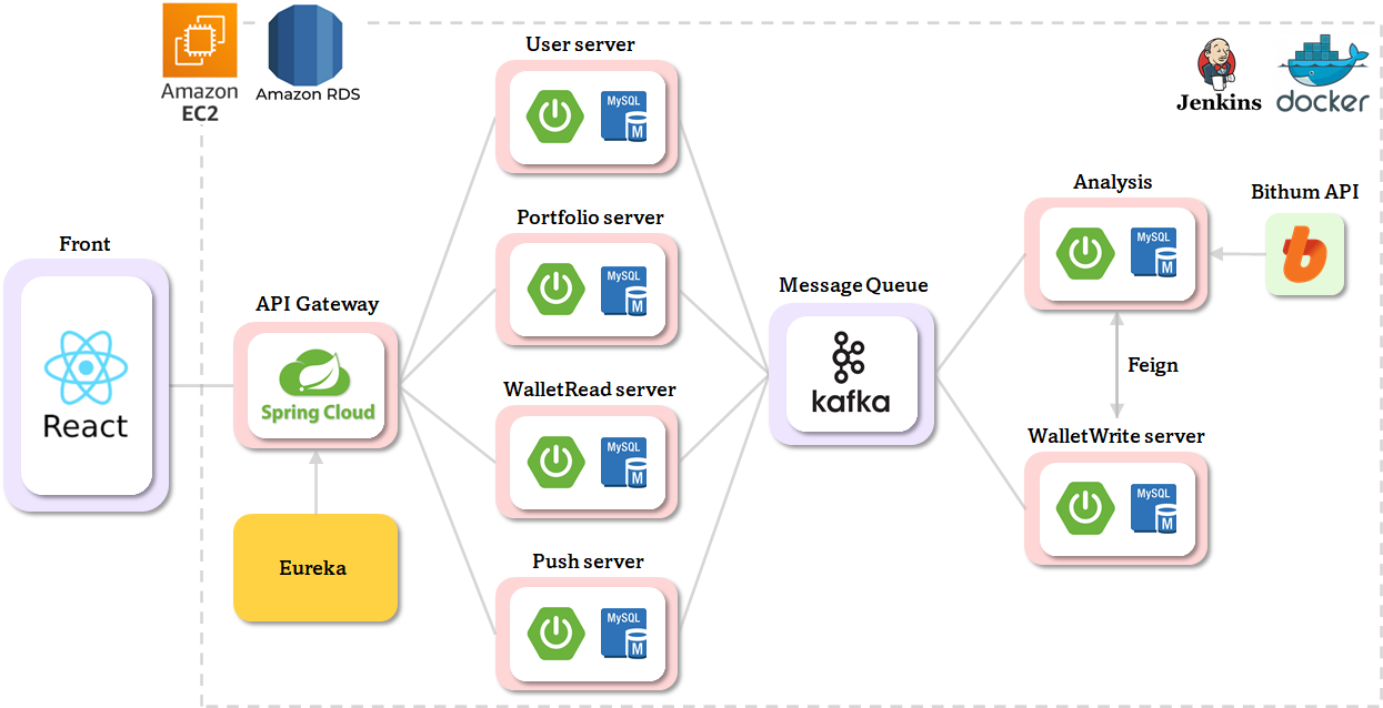 전체 서비스는 AWS의 EC2에 배포하였으며, jenkins를 통한 배포 자동화로 MSA의 장점을 살렸습니다.