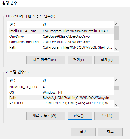 JDK에 저장된 bin폴더를 찾아가야 하기 때문에 path에 %JAVA_HOME%\bin으로 작성해준다.