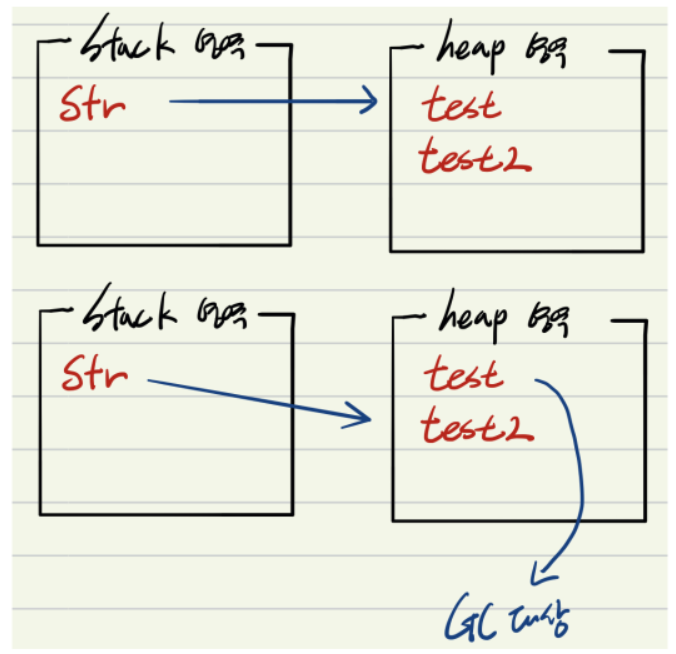 str = "test2"; // 재할당