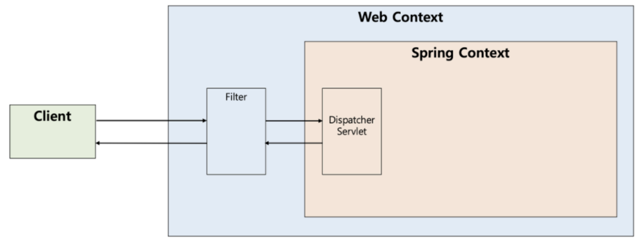 디스패처 서블릿은 스프링의 가장 앞단에 존재하는 프론트 컨트롤러이므로, 필터는 스프링 범위 밖에서 처리가 되는 것이다.