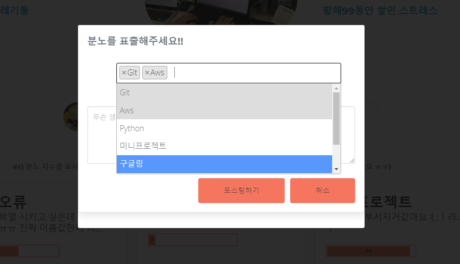 게시글 작성에서 키워드를 선택시에 부트스트랩 select2 박스를 이용해 여러 키워드를 선택할 수 있도록 만들었고