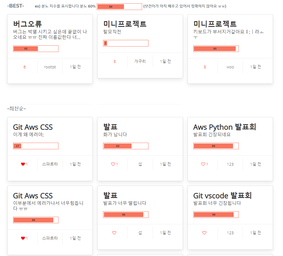 게시글은 공감수가 많이 등록된 best3 공간과 나머지 최신순을 보여주는 공간으로 분리를 하였고 azure 텍스트 아날리스트 api를 사용하여 작성된 텍스트에 분노지수를 게이지바로 표시해주었다.