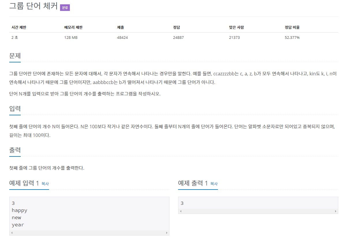 그룹 단어란 단어에 존재하는 모든 문자에 대해서, 각 문자가 연속해서 나타나는 경우만을 말한다. 예를 들면, ccazzzzbb는 c, a, z, b가 모두 연속해서 나타나고, kin도 k, i, n이 연속해서 나타나기 때