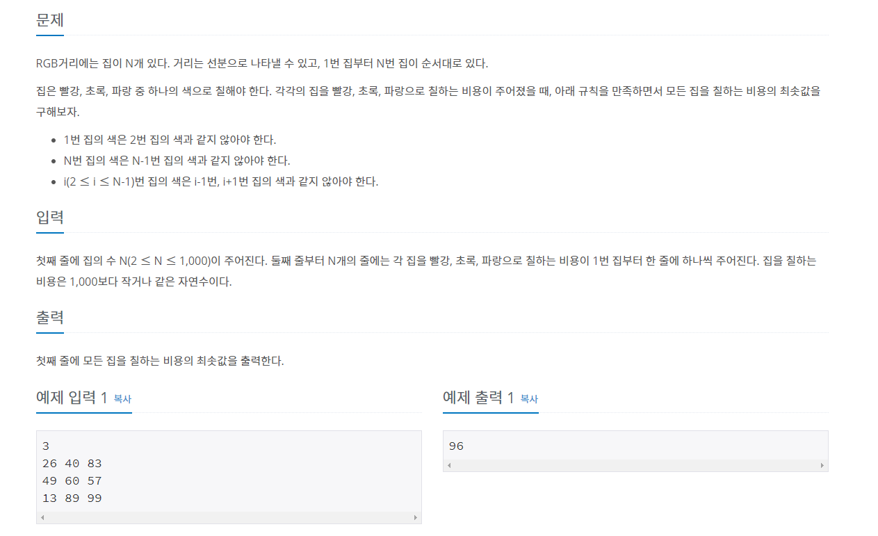 첫째 줄에 집의 수 N(2 ≤ N ≤ 1,000)이 주어진다. 둘째 줄부터 N개의 줄에는 각 집을 빨강, 초록, 파랑으로 칠하는 비용이 1번 집부터 한 줄에 하나씩 주어진다. 집을 칠하는 비용은 1,000보다 작거나