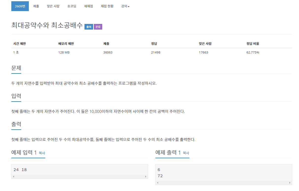첫째 줄에는 입력으로 주어진 두 수의 최대공약수를, 둘째 줄에는 입력으로 주어진 두 수의 최소 공배수를 출력한다.