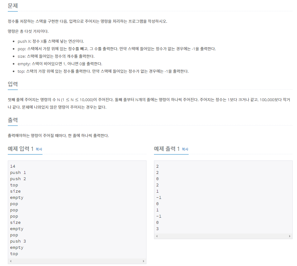 스택을 직접 구현하는 문제인데 반복문에서 input()으로 받게되면 시간초과가 떠서 sys를 import해줘서