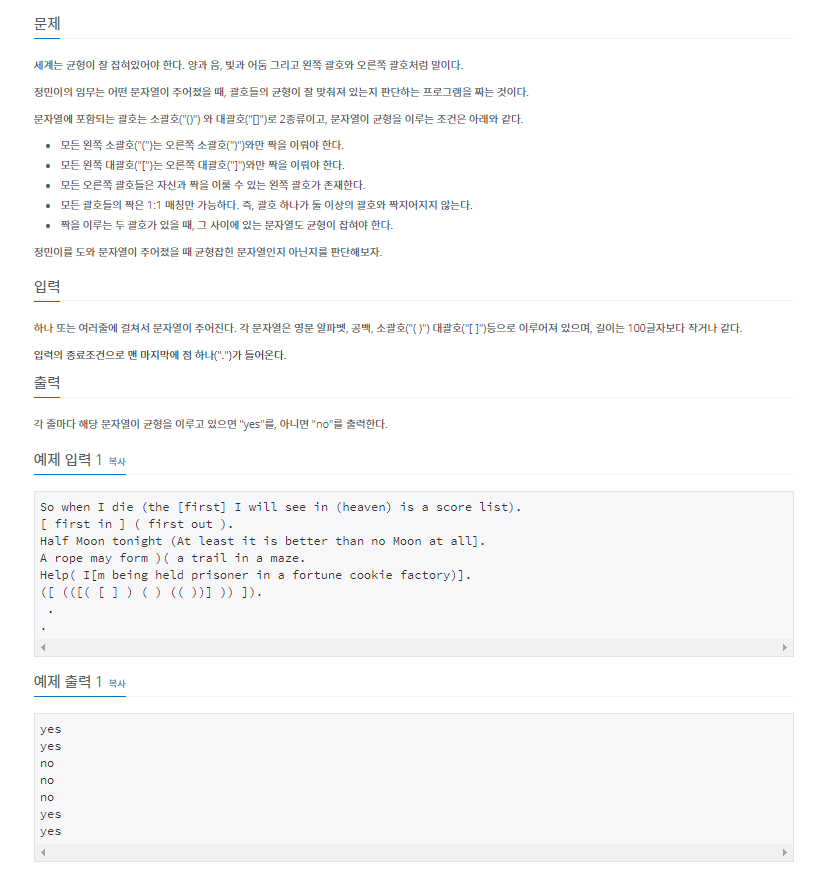 하나 또는 여러줄에 걸쳐서 문자열이 주어진다. 각 문자열은 영문 알파벳, 공백, 소괄호("( )") 대괄호("[ ]")등으로 이루어져 있으며, 길이는 100글자보다 작거나 같다. 입력의 종료조건으로 맨 마