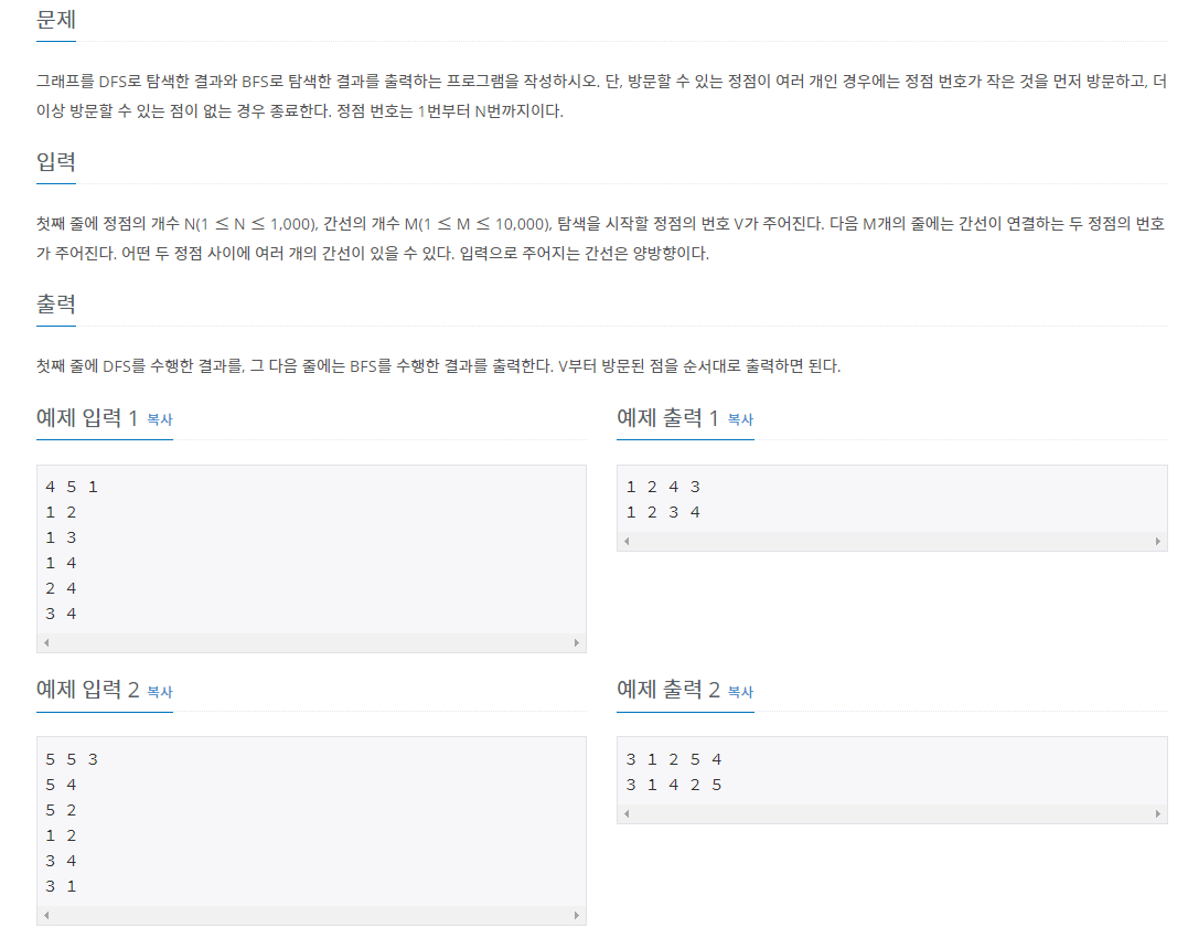 느낀점은 dfs bfs를 풀때 인접리스트 보다는 인접행렬로 푸는게 나을 것 같다는 생각이 들었고 dfs를 구현할때는 스택보다는 재귀로 구현하는게 좋은 것 같다.
