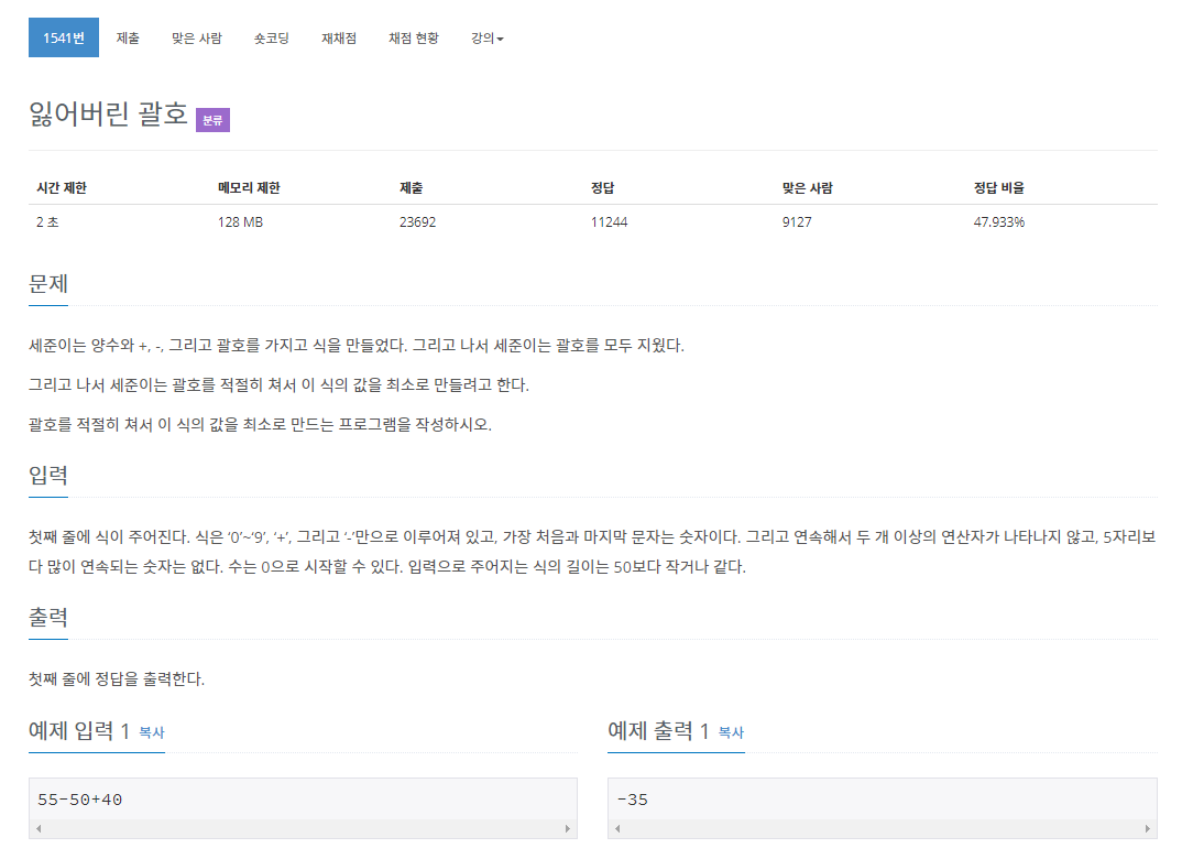입력값중에 괄호를 적절히 쳐서 최솟값으로 만드는 문제이다.