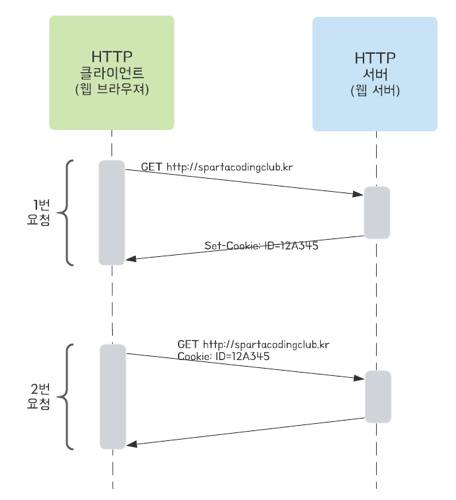 위에 그림에서 클라이언트의 요청을 서버에게 보낸 후 응답을 받을 때 까지가 하나의 HTTP요청이다. 하지만 HTTP 상태는 기억되지 않기 때문에 웹 서버에서는 1번과 2번이 같은 클라이언트의 요청인지 알 수 없다.