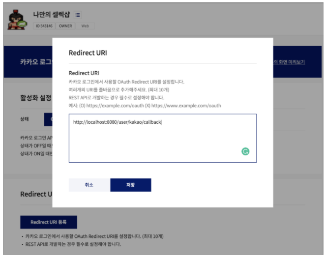 - 카카오로 로그인 했을 때 인가토큰을 받게 될 Redirect URI (callback) 를 설정하기 (로그인 끝나고 부를 API)