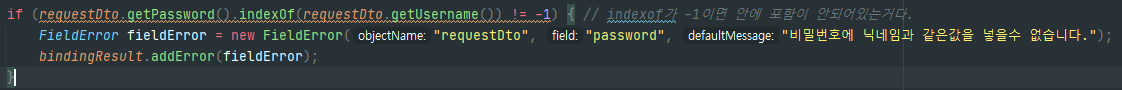 비밀번호에 닉네임과 같은값이 포함되어있으면 에러보내기