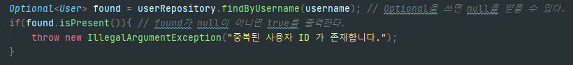 Optional을 사용하면 객체에 null도 받을 수 있게되어서 따로 null일경우에 대한 예외처리를 할 필요가 없어지게 된다.