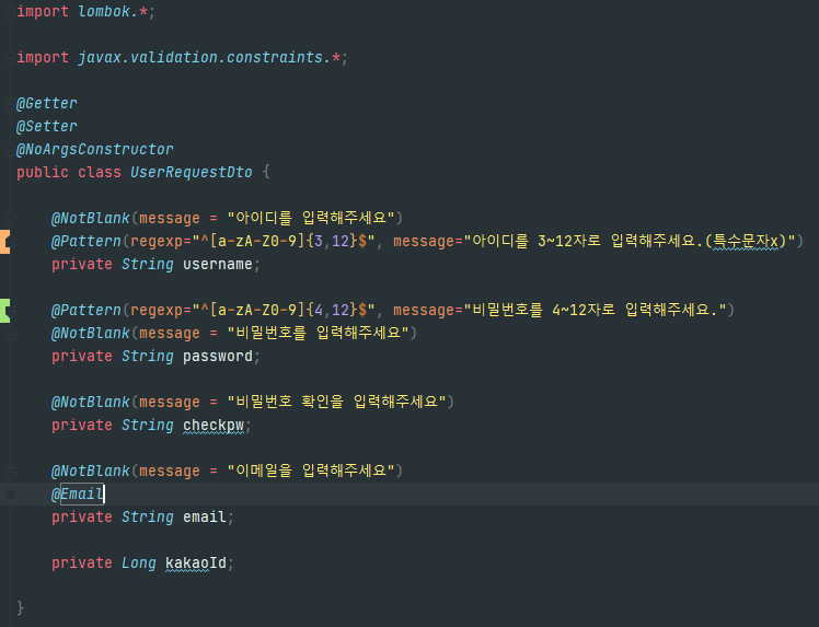 validation에서 제공하는 어노테이션을 사용해 Dto에대해 유효성 검사를 해줬다.