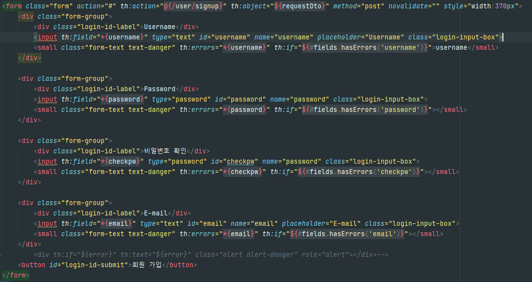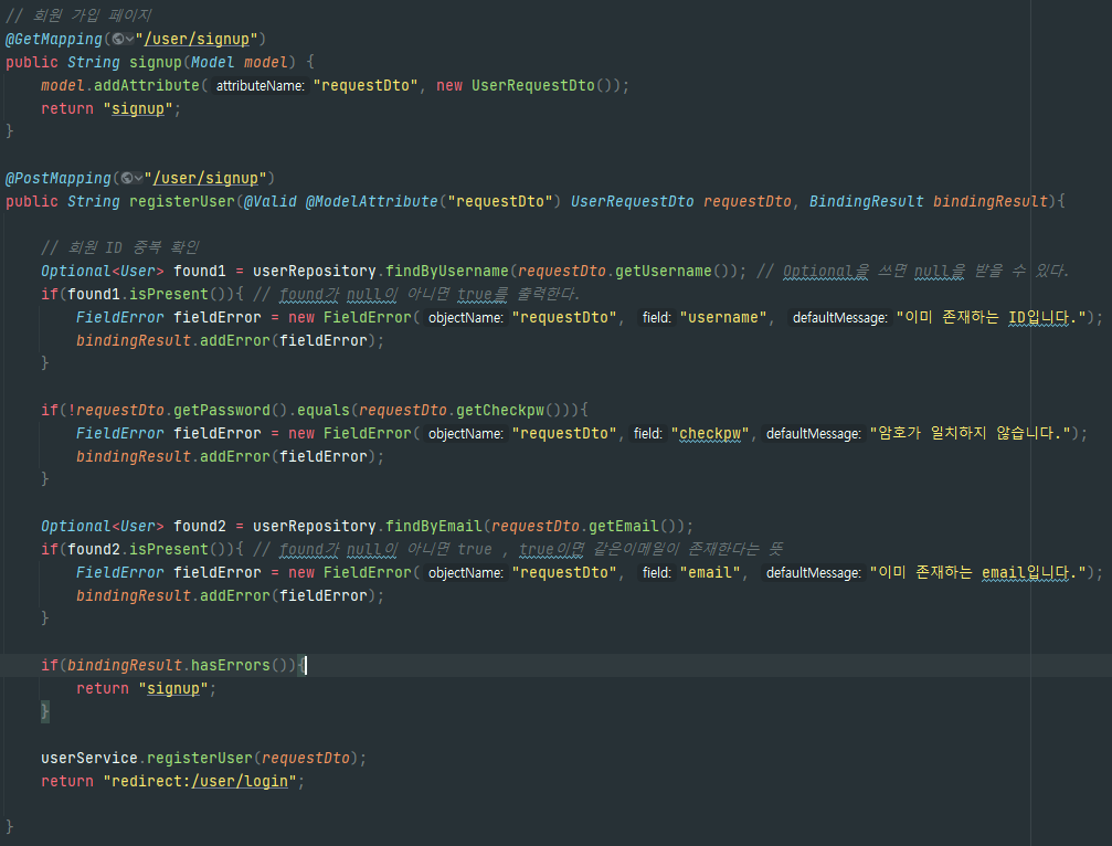 @Valid 어노테이션을 통해 requestDto에 대해 유효성검사를 진행하고 에러가 존재할 시 다시 회원가입창을 불러내 에러를 표시해준다. 그리고 Dto에 지정된 유효성 검사 말고도 아이디, 이메일 중복체크와 비밀번호가 일치하는지 확인을 해줘야 하기 때문에 if문을 추가했다.