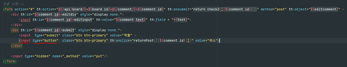 이걸 해결해주기 위해서는 button태그를 사용하는것이 아니라 input태그에서 type을 button으로 바꿨더니 onsubmit이 호출이 안된다.