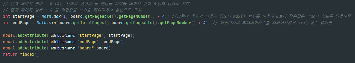 페이징 번호를 처리해주기 위해서 startPage와 endPage를 구해서 model로 값을 보내준다.