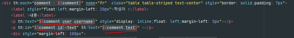 객체에서 username이라는 맴버변수를 가지고 오고 싶을때는 자바에서는 객체.getUsername()이렇게 사용하는데 타임리프에서는 객체.username 이런식으로 사용하면된다. (빨간줄은 무시해도 된다.)