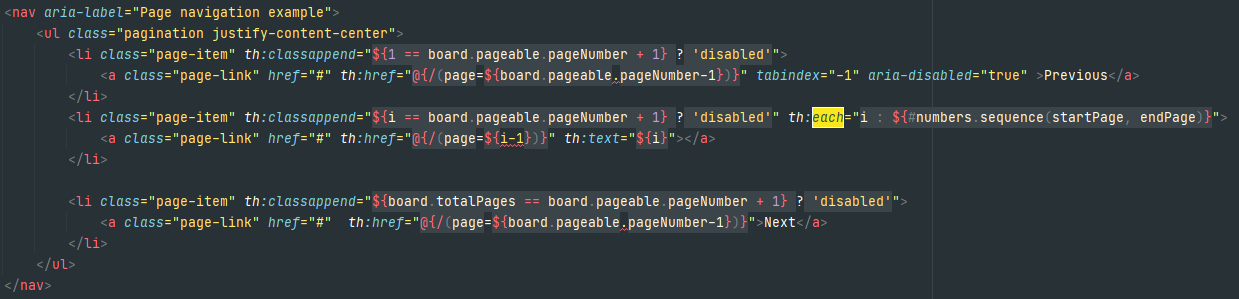 그리고 classappend를 사용해 특정 조건일 경우만 class에 disabled가 먹도록 설정해줬다 왜냐하면 첫번째 페이지일 경우 previous가 눌리면 안되고 현재 자신의 page도 눌리면 안되기 때문이다.