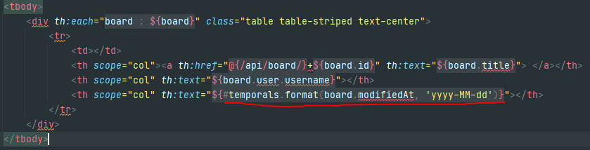 Timestamped를 상속받아 createdAt, modifiedAt 게시글에 생성일자와 마지막변경시점을 db에 저장하고있는데 이것을 게시글 생성일자 'yyyy-MM-dd' 로 나타내주고 싶어서 #temporals.format() 함수를 사용하여 나타내었다. (MM만 대문자인 이유는 mm은 분 을 나타내고 MM이 월 을 나타낸다.)
