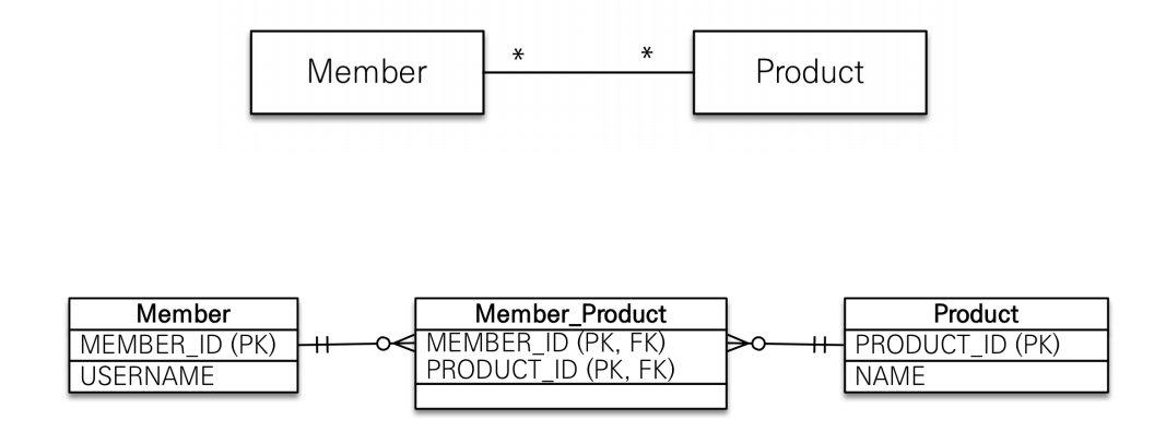 관계형 데이터베이스는 정규화된 테이블 2개로 다대다 관계를 표현할 수 없다.