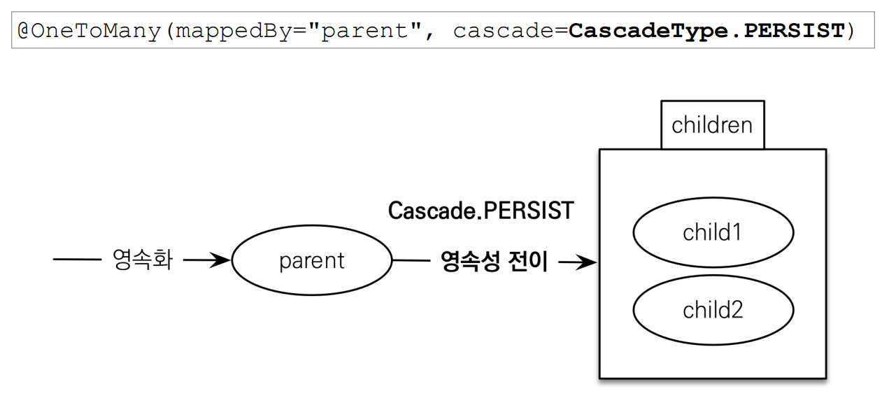 - 엔티티를 영속화할 때 연관된 엔티티도 함께 영속화 하는 편리함을 제공할 뿐이다.