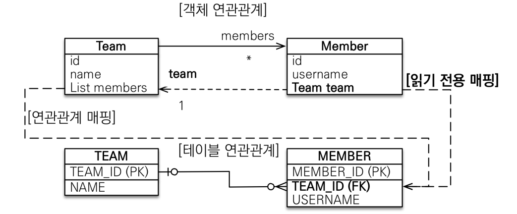 - @JoinColumn(insertable = false, updateable = false) , 읽기전용 필드를 사용해서 양방향 처럼 사용하는 방법