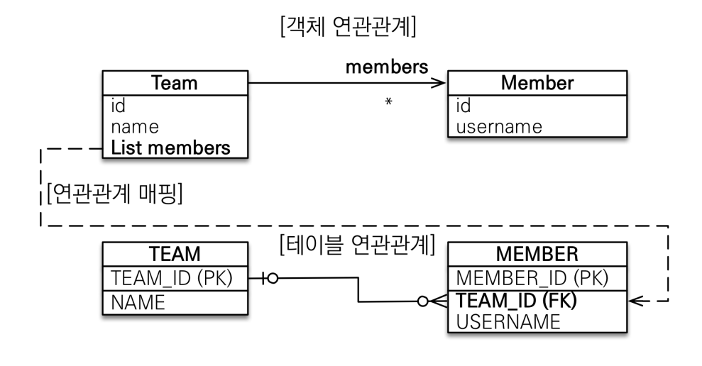 하지만 객체는 컬렉션을 사용해서 객체 2개로 다대다 관계가 가능하다.