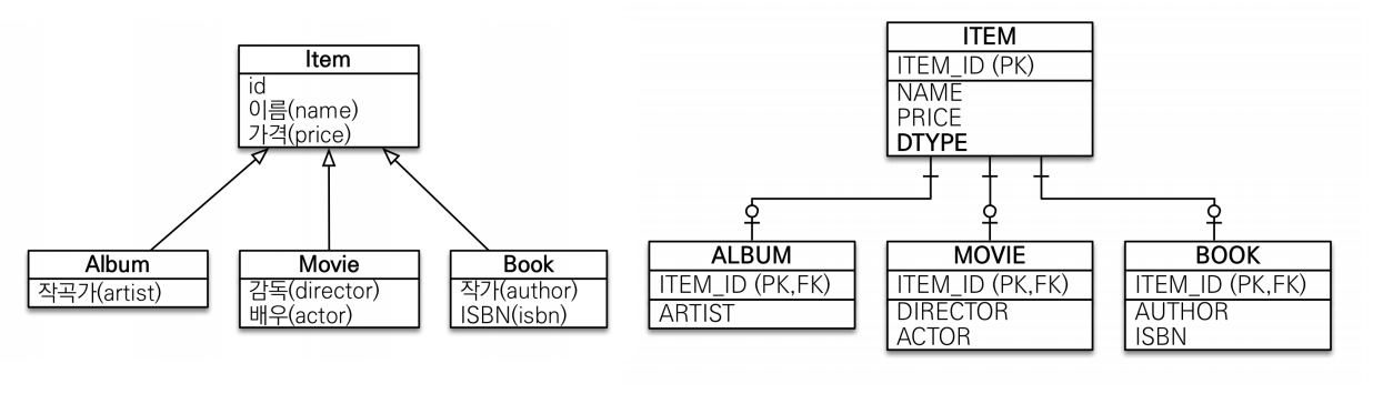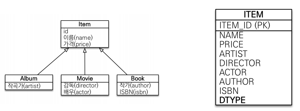 - @DiscriminatorColumn(name="DTYPE") : 부모 엔티티에 붙여준다, 어느 자식의 값이 들어온건지 알 수 있다.