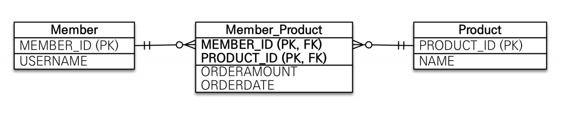 - 테이블에 중간 테이블이 있는것처럼 객체에서도 중간 엔티티를 사용해 ManyToMany를 풀어서 사용해야한다.