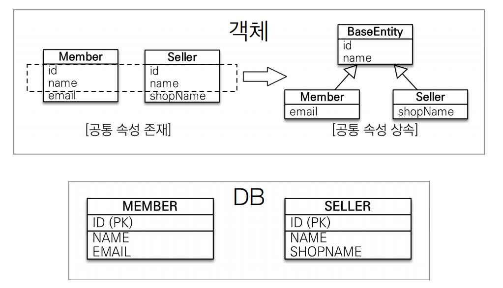- 참고 : @Entity 클래스는 @Entity나 @MappedSuperclass로 지정한 클래스만 상속 가능