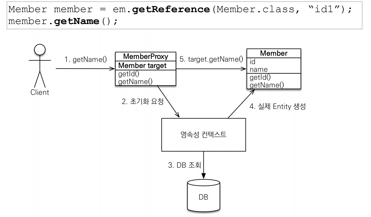 - 영속성 컨텍스트에 찾는 엔티티가 이미 있으면 em.getReference()를 호출해도 실제 엔티티 반환