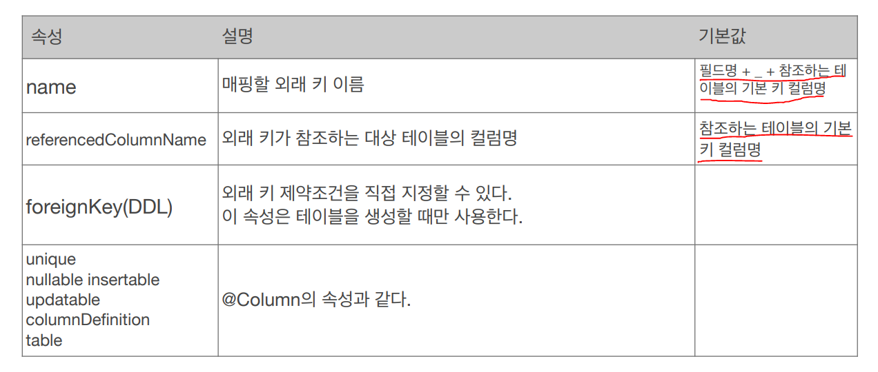 - 객체와 테이블의 차이 발생, JoinColumn을 꼭 사용해야함 (그렇지 않으면 중간에 테이블을 하나 추가해서 사용한다.)