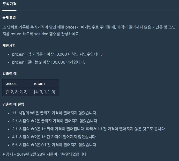 주식가격 배열이 [1,2,3,2,3] 일때 각 인덱스 자리마다 가격이 떨어지지않은 시간 초를 구하는 문제이다.