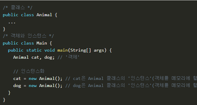 - 객체는 현실 세계에 가깝고, 인스턴스는 소프트웨어 세계에 가깝다.