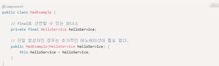 - 생성자 주입 시, 의존성 주입이 클래스 인스턴스화 중에 시작되므로 final을 선언할 수 있다. 따라서 객체를 변경이 불가능하게 할 수 있다.
